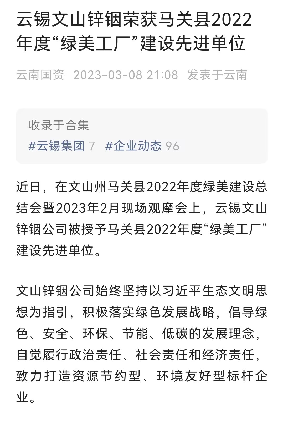 云南國資、云南政協報:云錫控股公司所屬文山鋅銦榮獲馬關縣2022年度“綠美工廠”建設先進單位