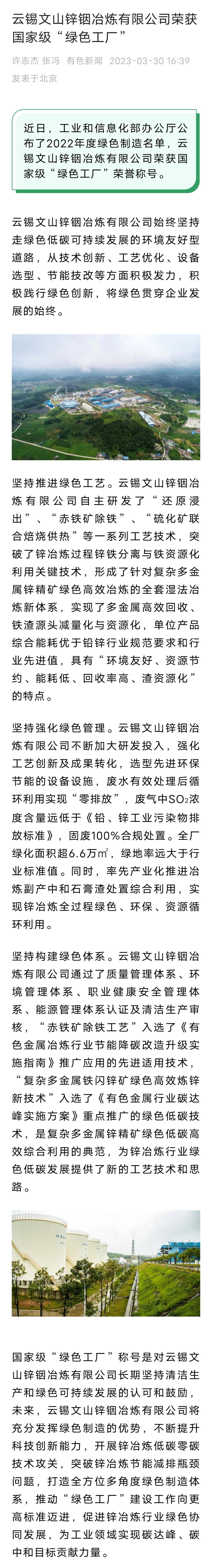 有色新聞:云錫文山鋅銦冶煉有限公司榮獲國家級“綠色工廠”