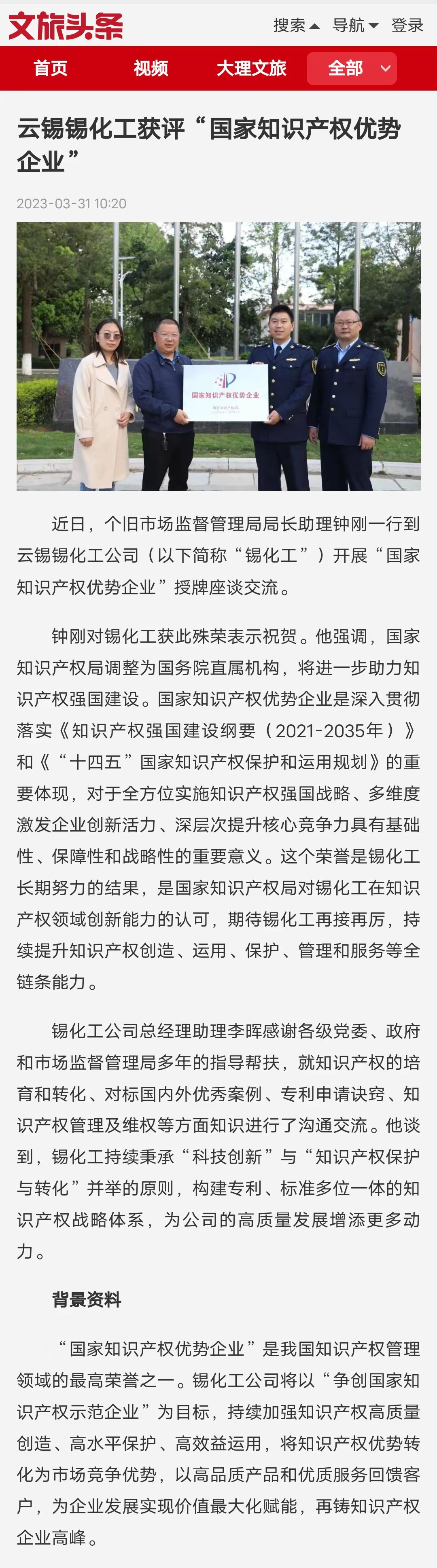 文旅頭條:云錫錫化工獲評“國家知識產(chǎn)權優(yōu)勢企業(yè)”