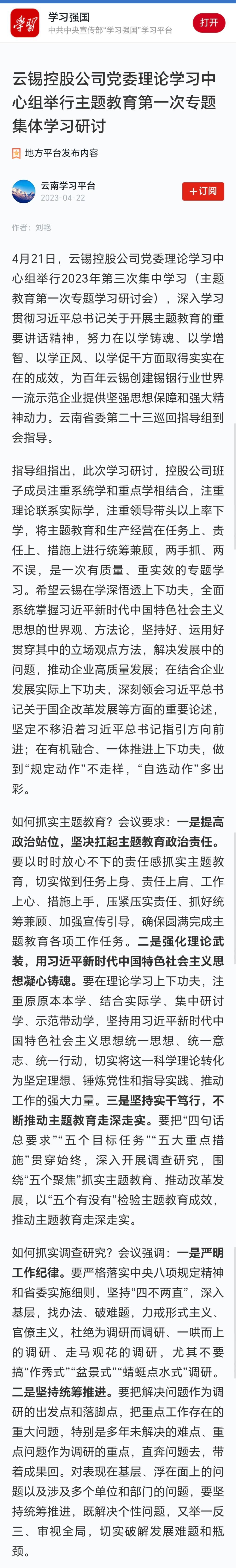 學(xué)習(xí)強國:云錫控股公司黨委理論學(xué)習(xí)中心組舉行主題教育第一次專題集體學(xué)習(xí)研討