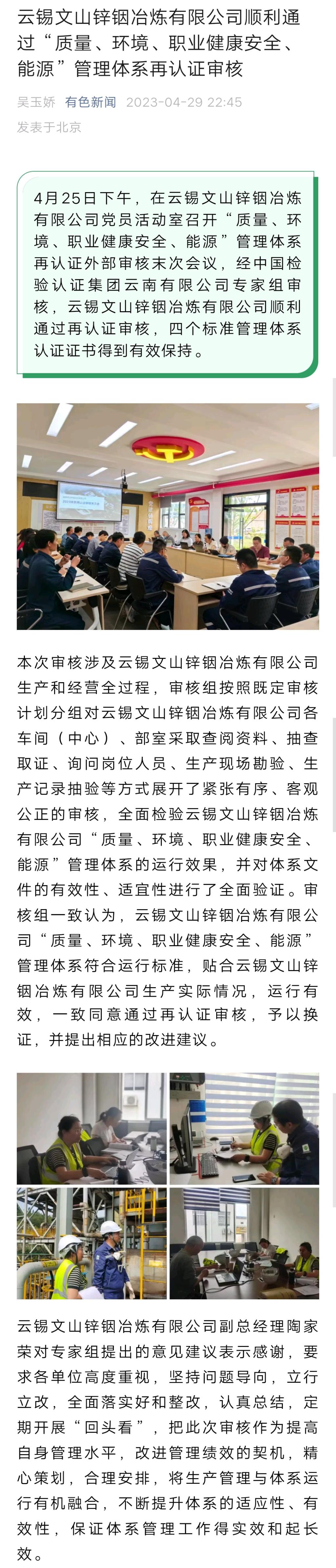 有色新聞:云錫文山鋅銦冶煉有限公司順利通過“質量、環境、職業健康安全、能源”管理體系再認證審核