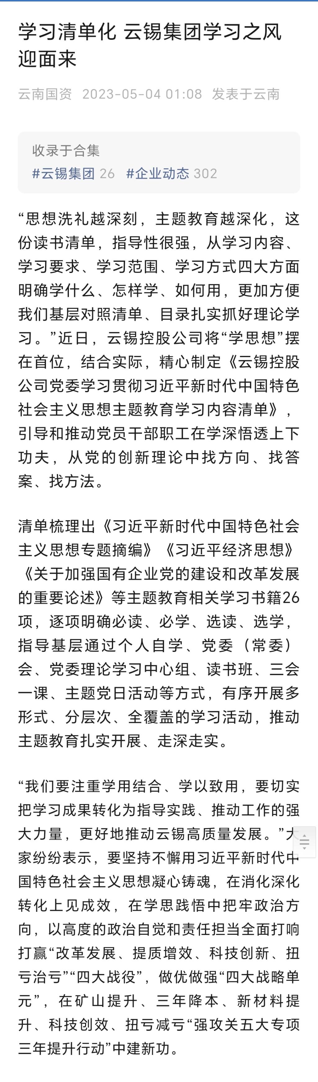 云南國資:學習清單化 云錫集團學習之風迎面來