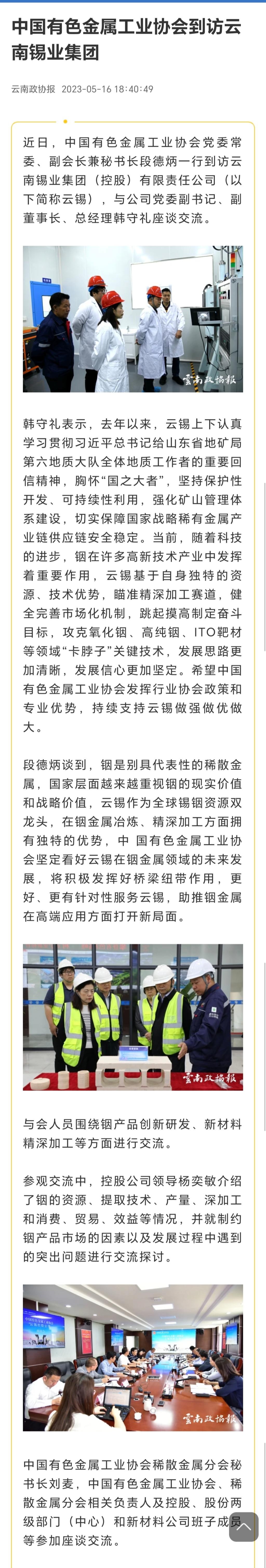 云南政協報:中國有色金屬工業協會到訪云南錫業集團