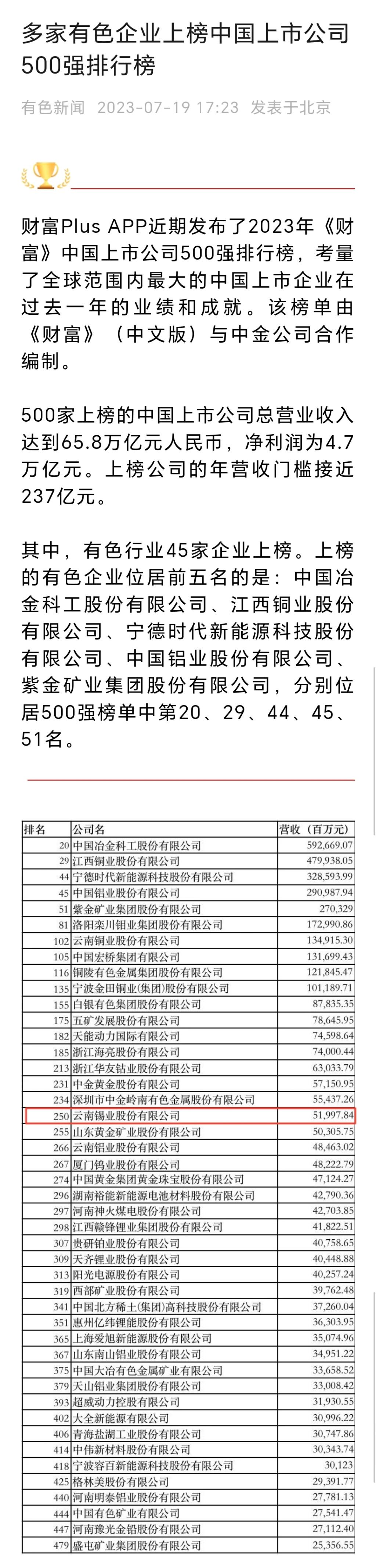 有色新聞:錫業股份位居中國上市公司500強榜單第250名