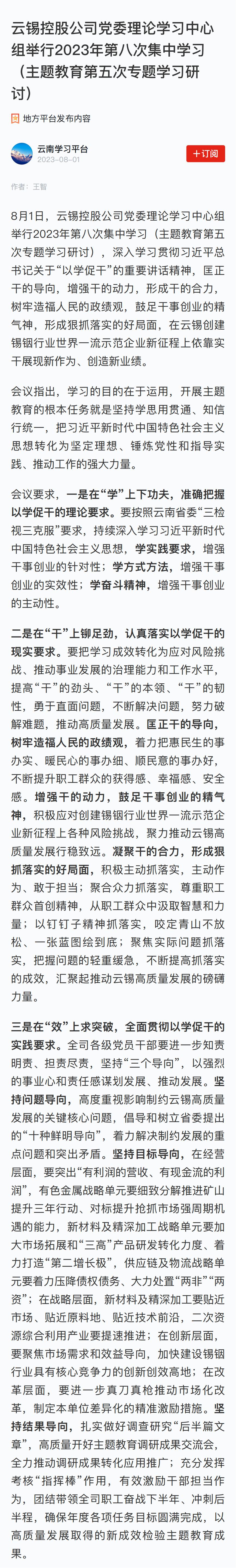 學習強國:云錫控股公司黨委理論學習中心組舉行2023年第八次集中學習(主題教育第五次專題學習研討)