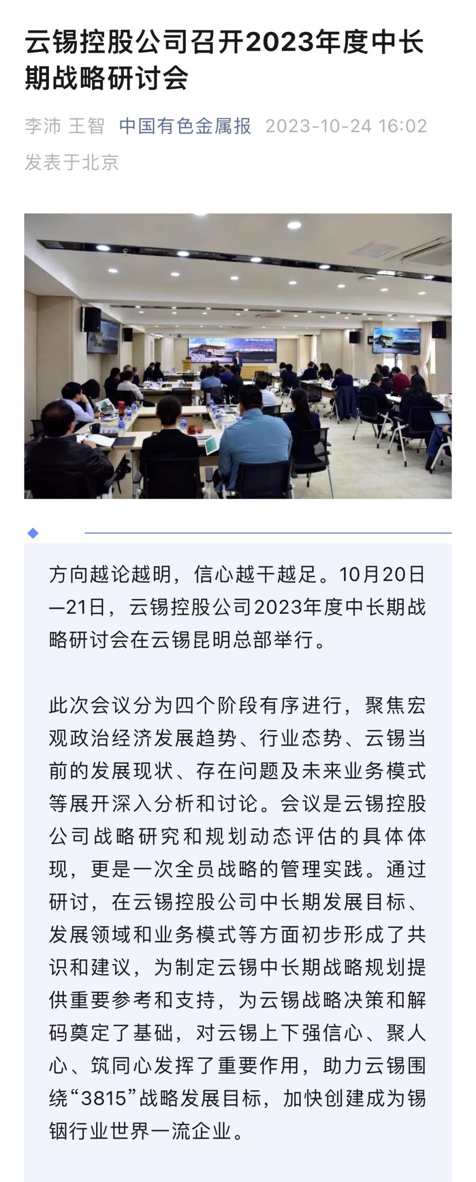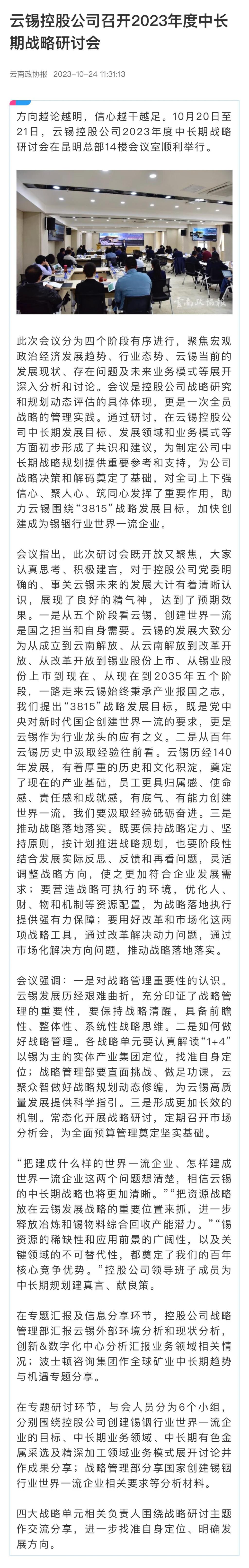 云南政協報、中國有色金屬報:云錫控股公司召開2023年度中長期戰略研討會