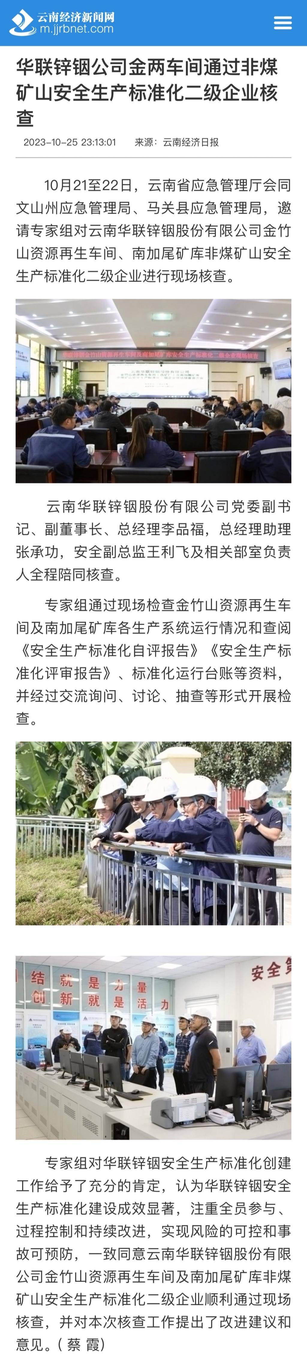 云南經濟日報:華聯鋅銦公司金兩車間通過非煤礦山安全生產標準化二級企業核查