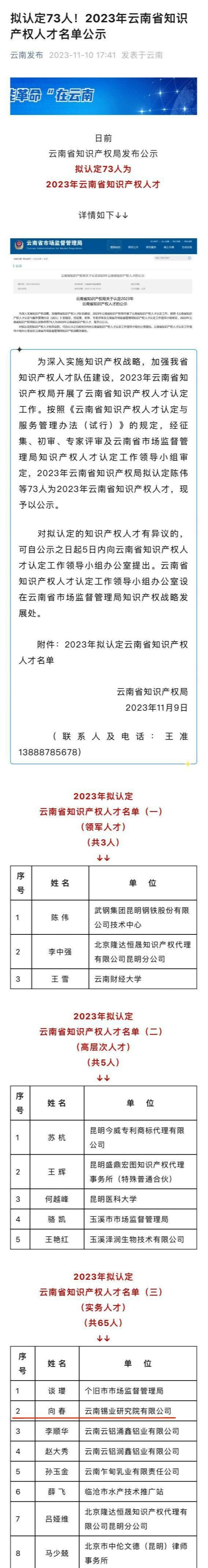 云南發布:擬認定73人!2023年云南省知識產權人才名單公示
