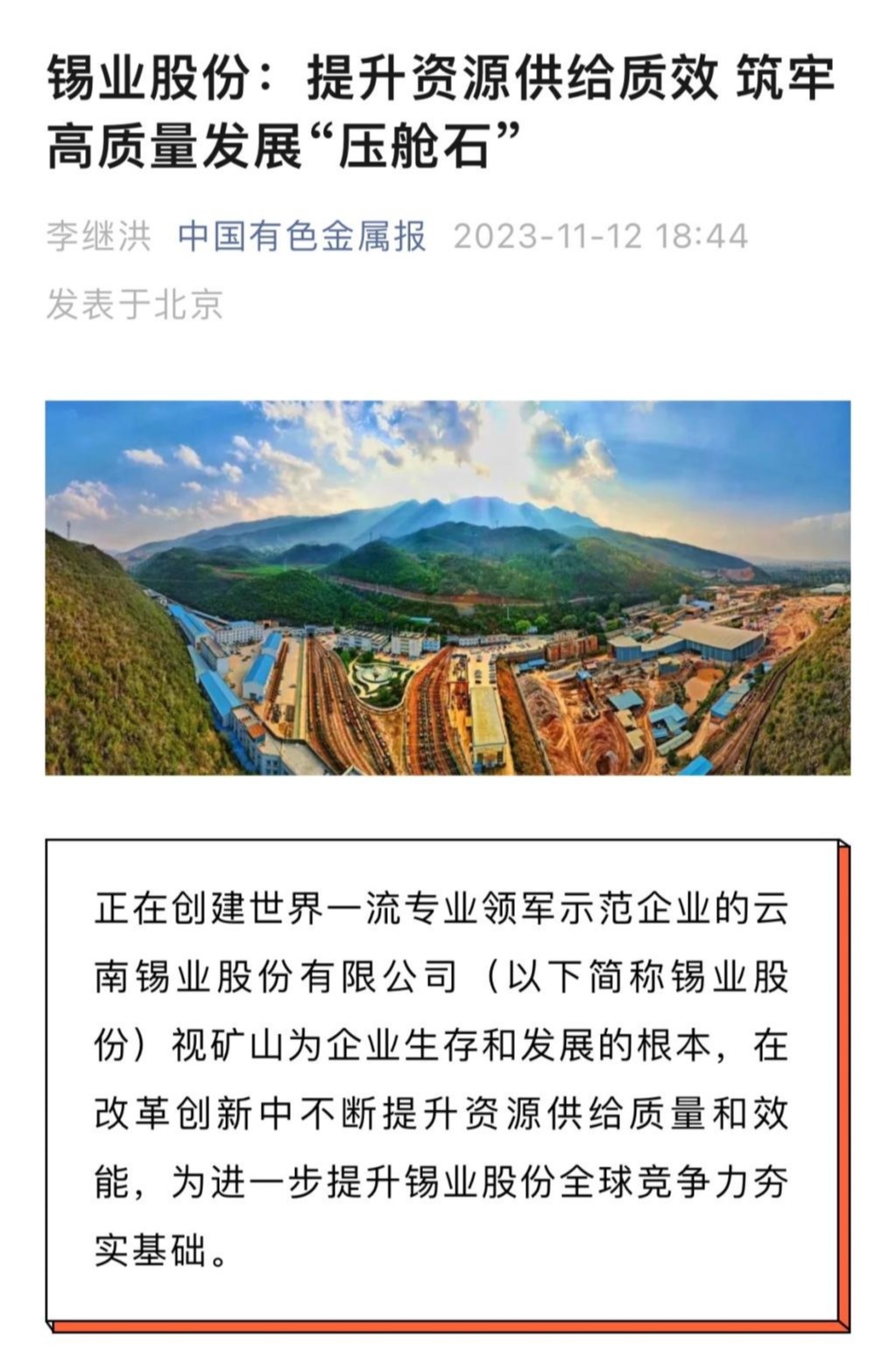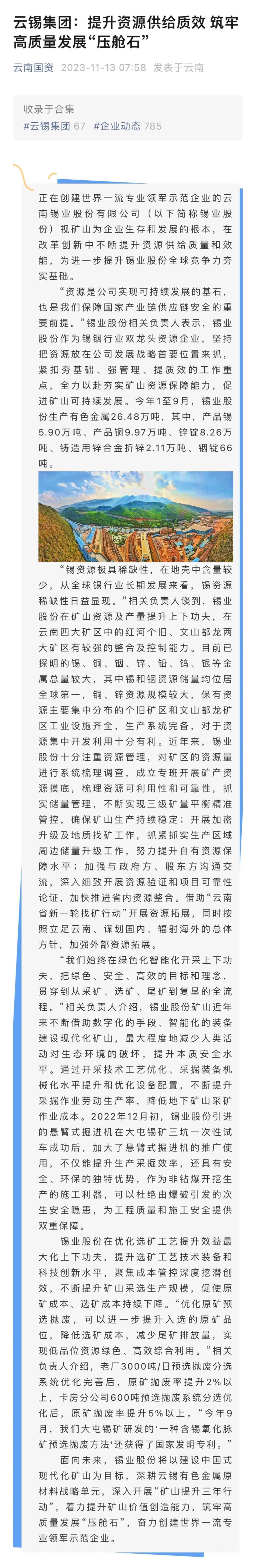 云南國資、中國有色金屬報:錫業股份提升資源供給質效 筑牢高質量發展“壓艙石”