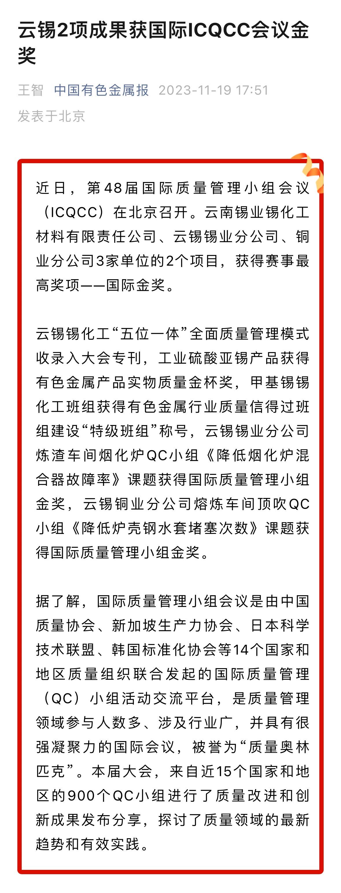 中國有色金屬報:云錫2項成果獲國際ICQCC會議金獎