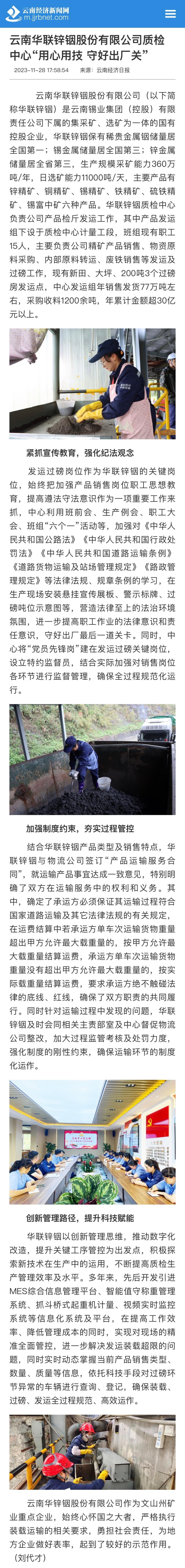 云南經濟日報:云南華聯鋅銦股份有限公司質檢中心“用心用技 守好出廠關”