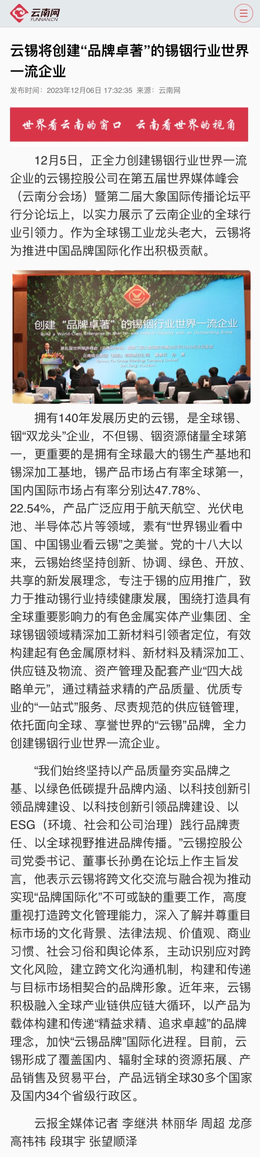 云南網:云錫將創建“品牌卓著”的錫銦行業世界一流企業