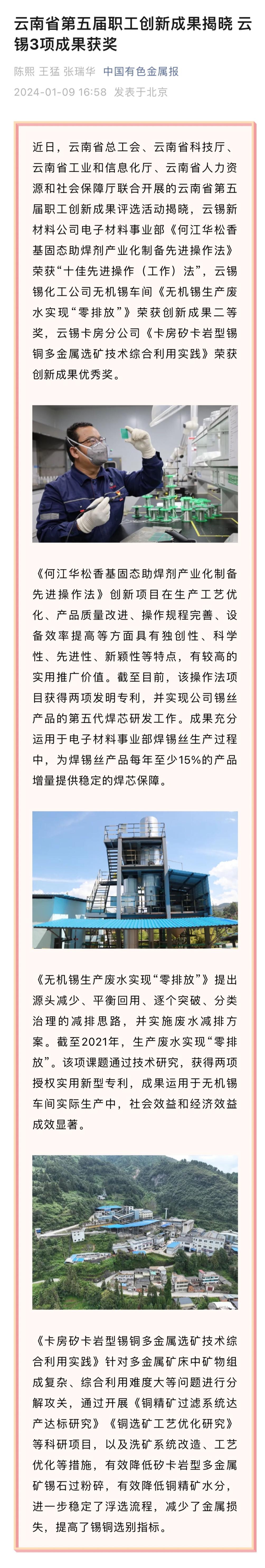中國有色金屬報:云南省第五屆職工創新成果揭曉 云錫3項成果獲獎