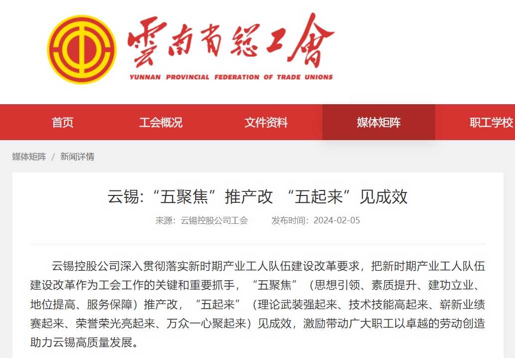 近日,云南省總工會刊發《云錫:“五聚焦”推產改 “五起來”見成效》,全面展現百年云錫產改工作新成效新氣象。