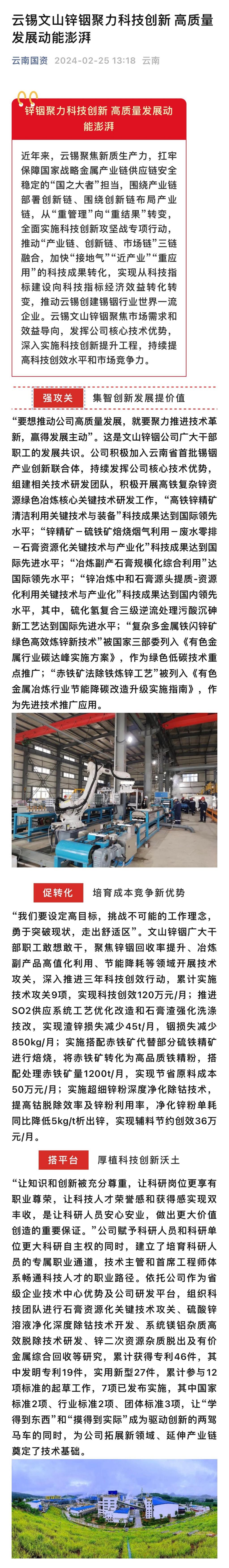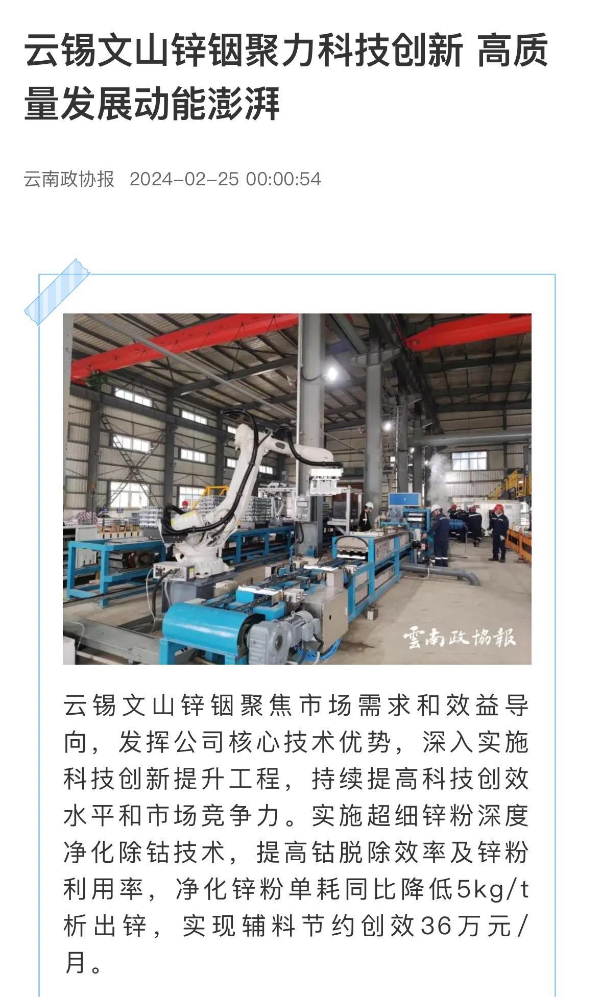云南國資、云南政協報:云錫文山鋅銦聚力科技創新 高質量發展動能澎湃