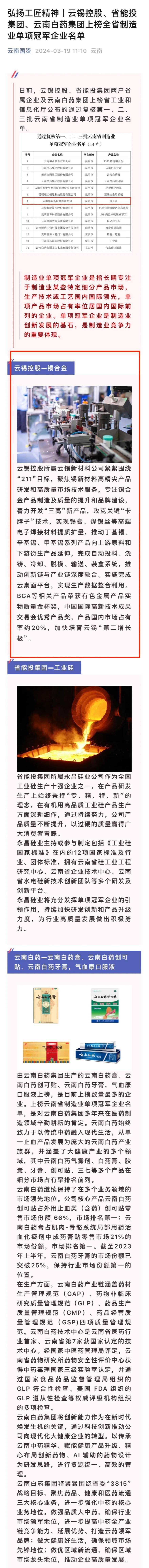 云南國資:云錫控股、省能投集團、云南白藥集團上榜全省制造業單項冠軍企業名單