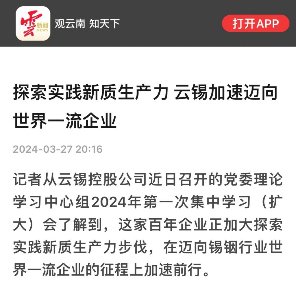 云南網、云新聞:探索實踐新質生產力 云錫加速邁向世界一流企業