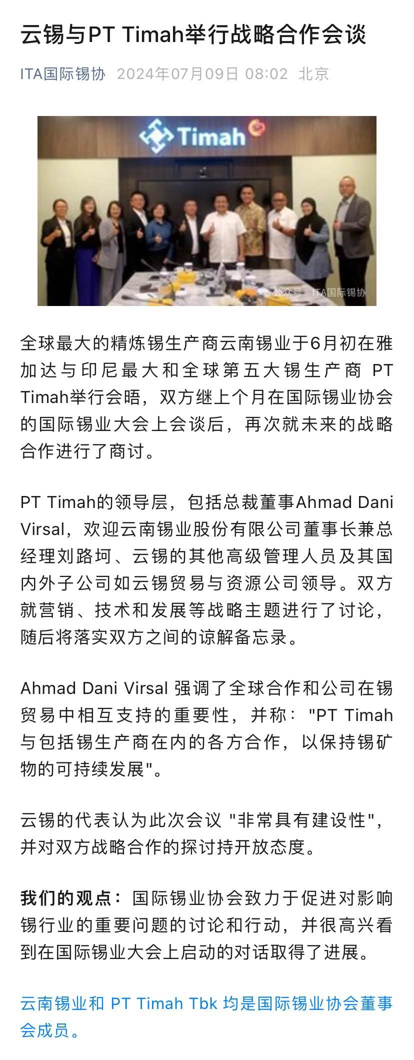 ITA國際錫協:云錫與PT Timah舉行戰略合作會談