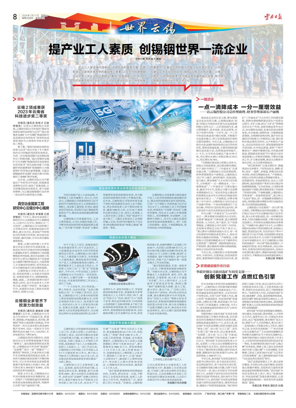 “通過(guò)黨組織建設(shè),打造一流技術(shù)工人隊(duì)伍,不斷塑造發(fā)展新動(dòng)能新優(yōu)勢(shì)。”劉俊告訴記者,云錫控股公司不斷健全工人技能培養(yǎng)、使用、評(píng)價(jià)、激勵(lì)制度,打破職稱(chēng)、收入和上升通道“天花板”,為人人皆可成才、人人盡展其才營(yíng)造良好環(huán)境。圍繞云錫“3815”戰(zhàn)略和重大戰(zhàn)略、重大工程、重大項(xiàng)目、重點(diǎn)產(chǎn)業(yè),廣泛深入持久開(kāi)展具有產(chǎn)業(yè)特色、單位特點(diǎn)的勞動(dòng)競(jìng)賽,強(qiáng)化集智創(chuàng)新平臺(tái)作用發(fā)揮,深化“四技五小兩比”等群眾性技術(shù)創(chuàng)新活動(dòng),積極承擔(dān)錫銦領(lǐng)域戰(zhàn)略性國(guó)家重大科技任務(wù),聚力攻關(guān)錫銦全產(chǎn)業(yè)鏈關(guān)鍵核心技術(shù),推動(dòng)高水平科技成果轉(zhuǎn)化,助力云錫打造國(guó)家錫銦產(chǎn)業(yè)技術(shù)創(chuàng)新高地。