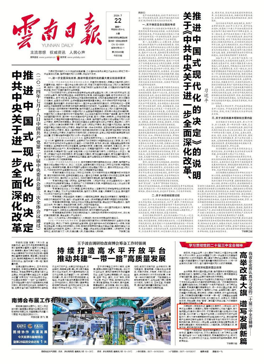 連日來,我省企業(yè)界人士認(rèn)真學(xué)習(xí)黨的二十屆三中全會精神,大家紛紛表示,全會科學(xué)擘畫了以進(jìn)一步全面深化改革推進(jìn)中國式現(xiàn)代化的宏偉藍(lán)圖,要認(rèn)真學(xué)習(xí)貫徹全會精神,切實把全會重大改革部署轉(zhuǎn)化為推動高質(zhì)量發(fā)展的實際成效,以進(jìn)一步全面深化改革為動力,奮力譜寫中國式現(xiàn)代化的云南篇章。