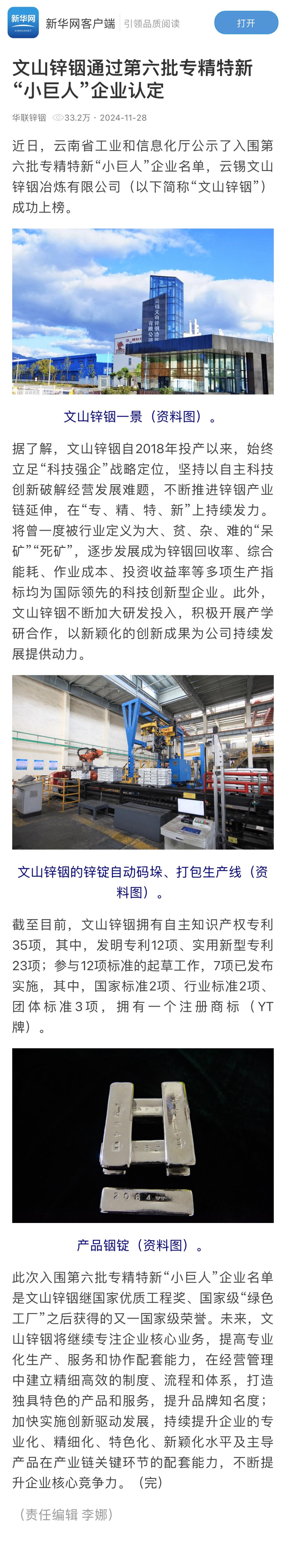 新華網:文山鋅銦通過第六批專精特新“小巨人”企業認定