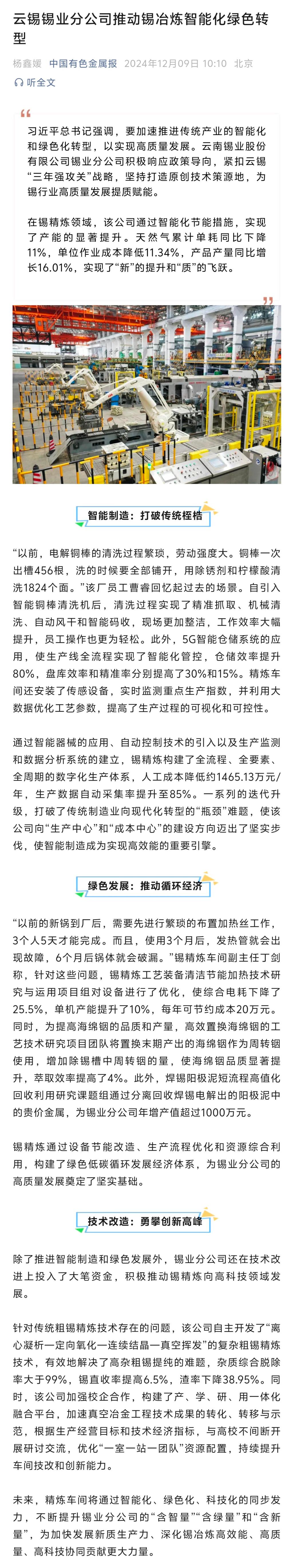 中國有色金屬報:錫業分公司推動錫冶煉智能化綠色轉型