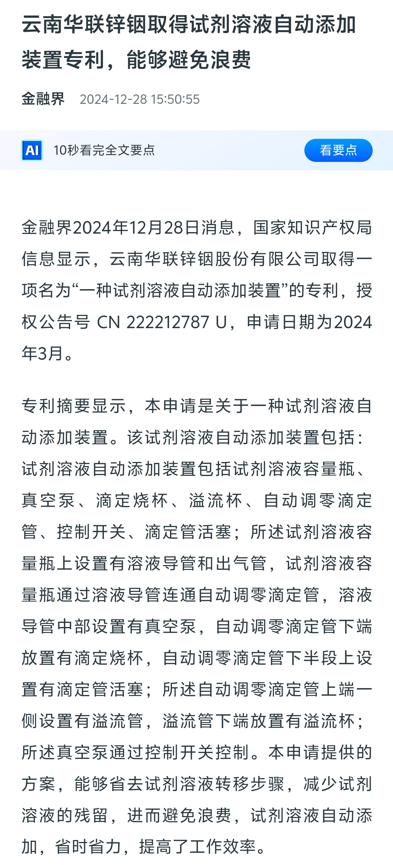金融界:云南華聯鋅銦取得試劑溶液自動添加裝置專利,能夠避免浪費
