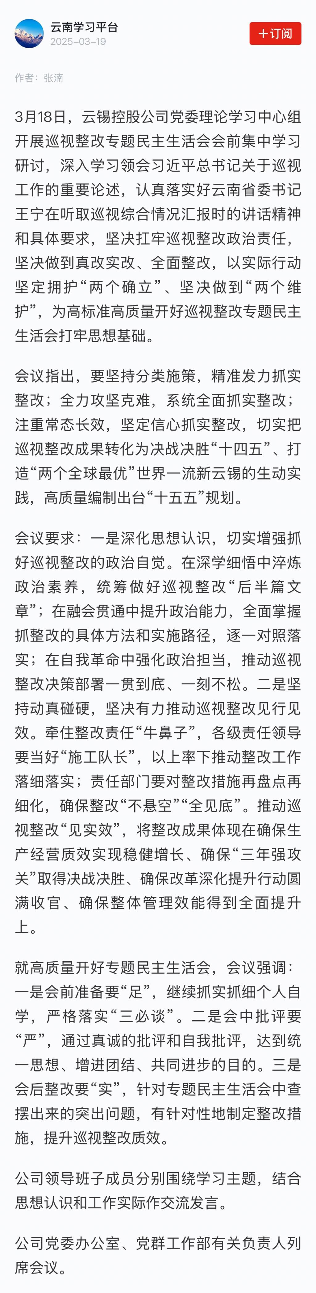 學習強國:云錫控股公司黨委理論學習中心組開展巡視整改專題民主生活會會前集中學習