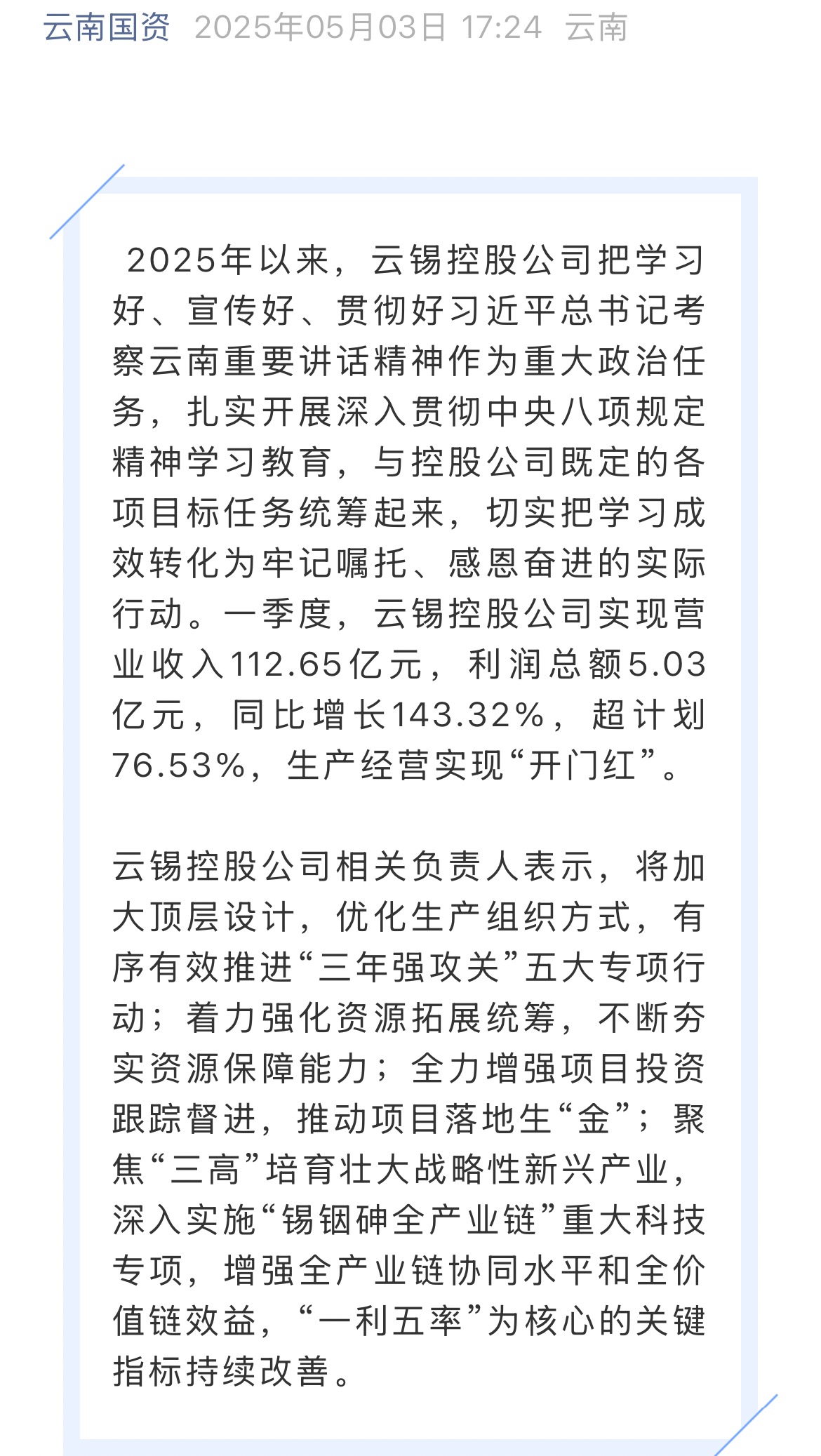 云錫控股公司一季度實現開門紅——利潤總額同比增長143.32%
