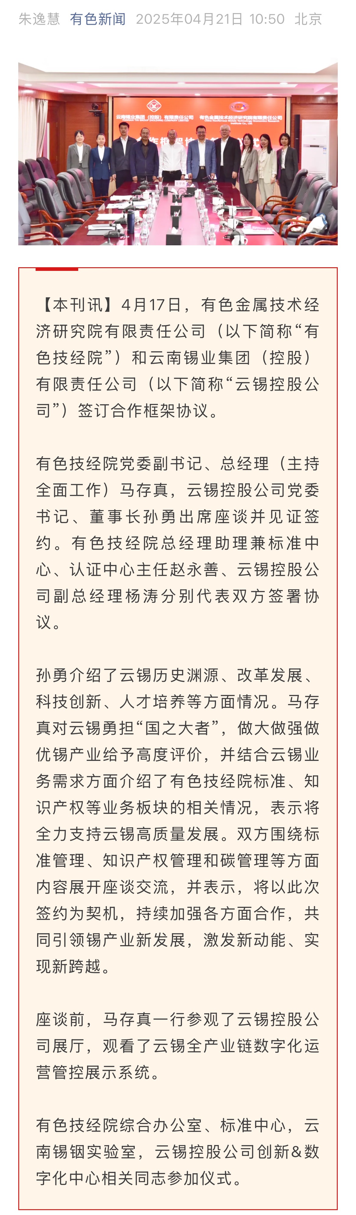 有色新聞:有色技經院與云錫控股公司簽訂合作框架協議