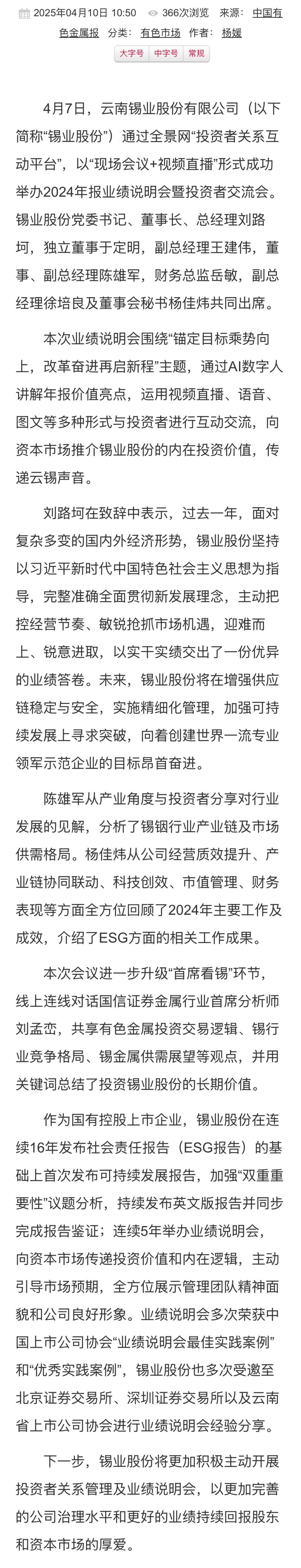 中國有色金屬報(bào):錫業(yè)股份成功舉辦2024年報(bào)業(yè)績說明會(huì)
