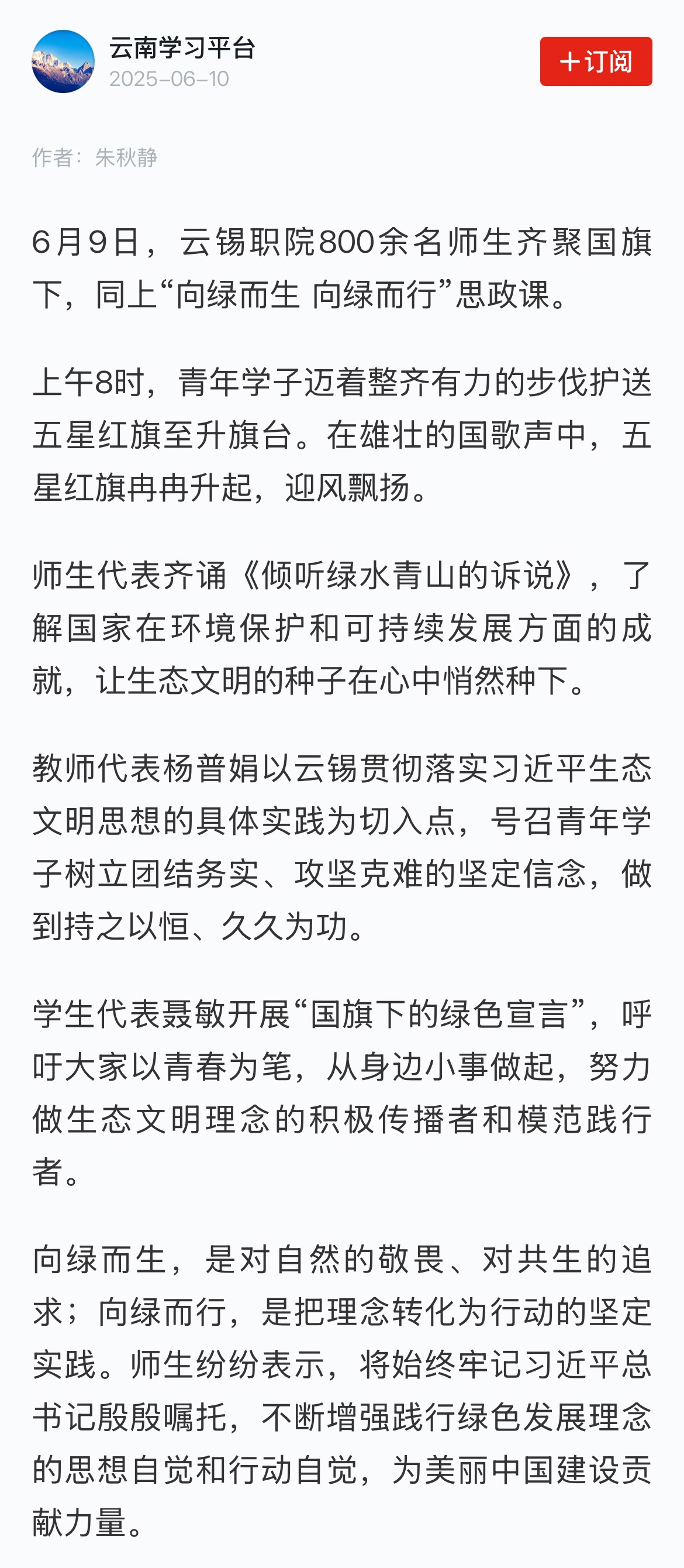 學習強國:云錫職院開展“向綠而生 向綠而行”思政課