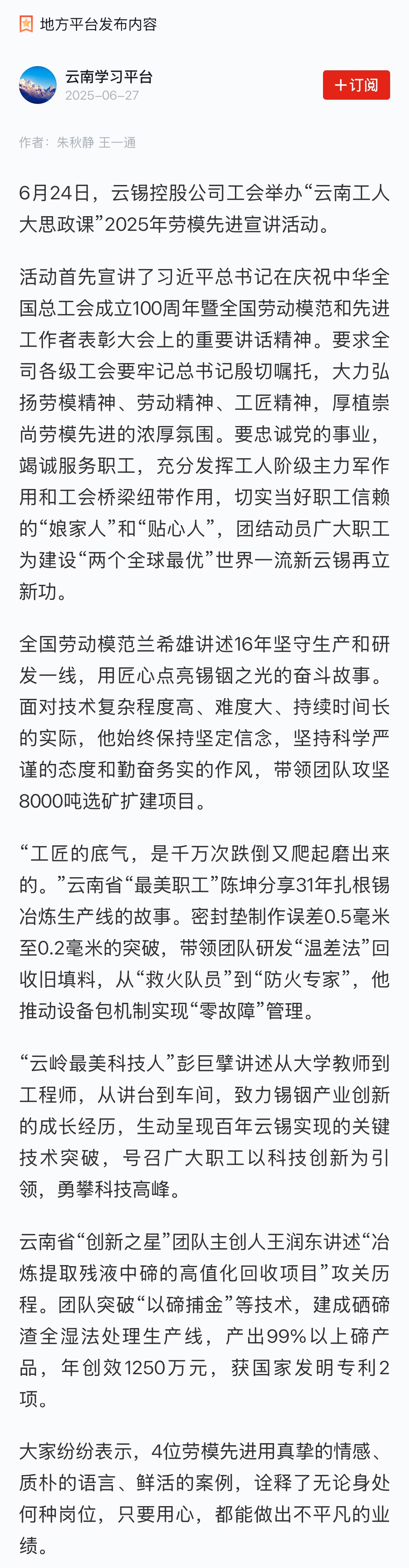 學(xué)習(xí)強(qiáng)國:云錫控股公司工會(huì)舉辦“云南工人大思政課”2025年勞模先進(jìn)宣講活動(dòng)