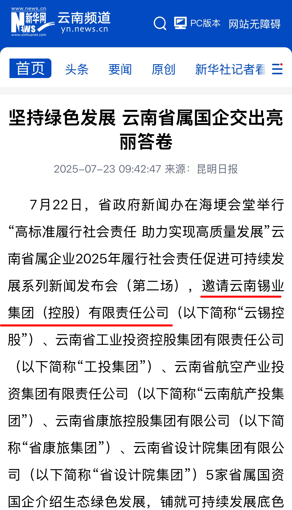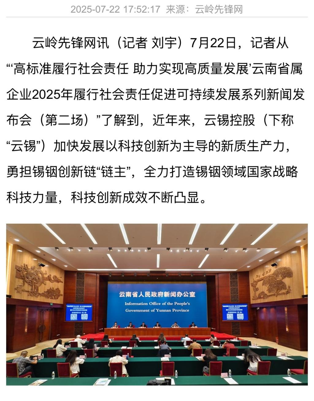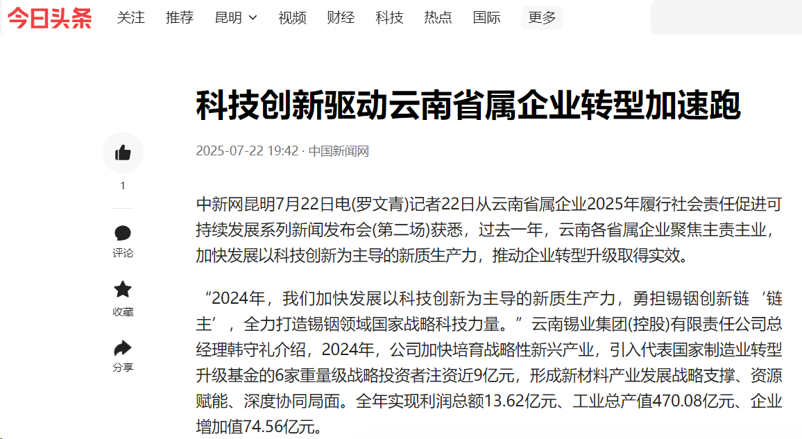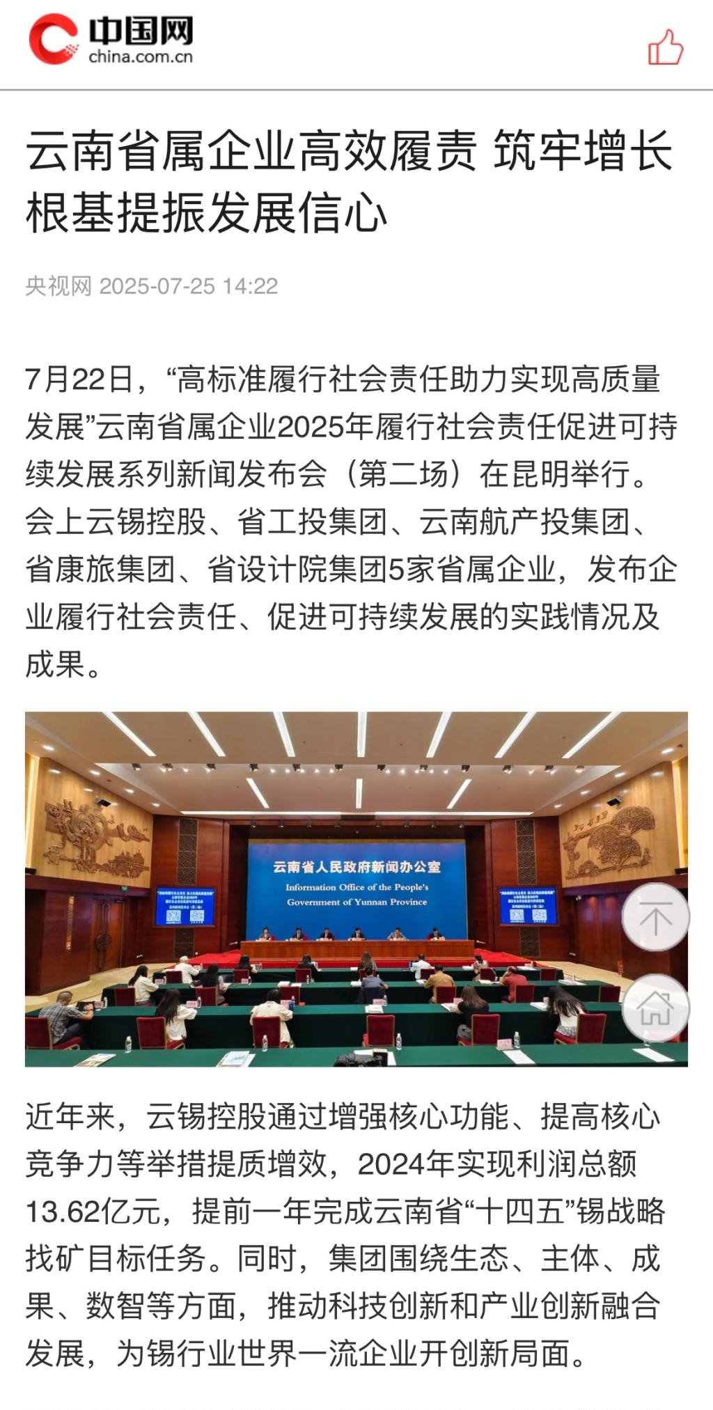 鏈接:(央廣網)、(央視影音)、(新華網)、(新華時訊)、(中國日報網)、(中國新聞網)、(中國網)(云南新聞聯播)、(云南衛視晚間新聞)、(云南發布)、(云南日報)、(云南日報-云新聞)、(云南網)、(七彩云端)、(云南省人民政府)、(云嶺先鋒網)、(云南國資)、(云南政協報)、(有色金屬報)、(有色新聞)、(騰訊新聞)、(今日頭條)、(搜狐)、(網易)、(新浪微博)、(新浪財經)、(都市時報)、(國泰君安)、(昆明日報)、(春城晚報)、(昆明信息港)、(開屏新聞)
