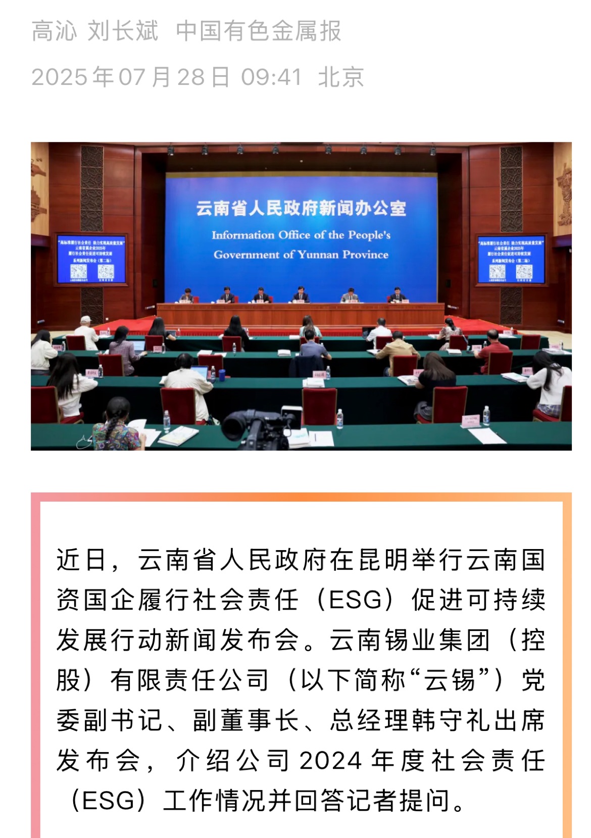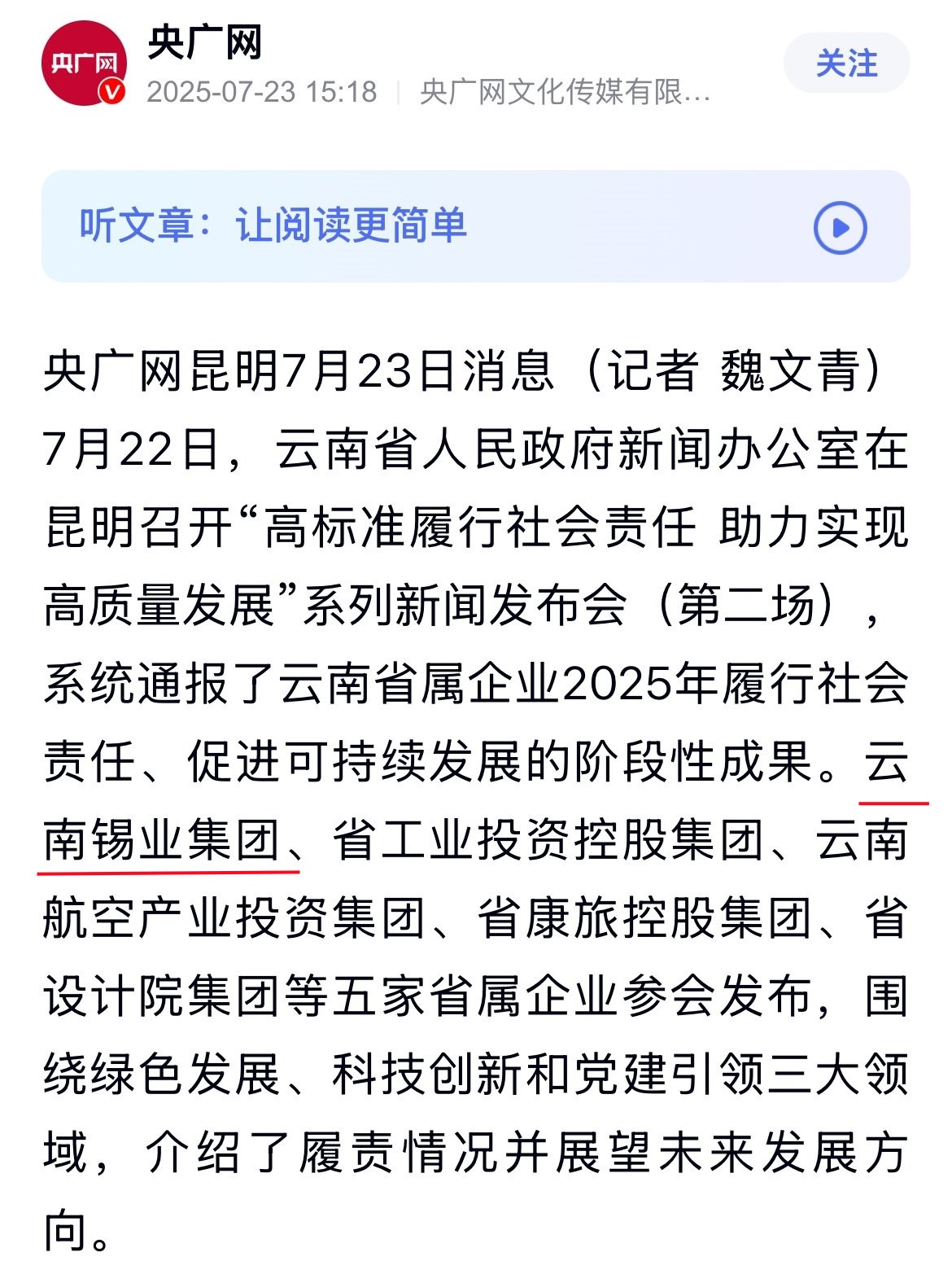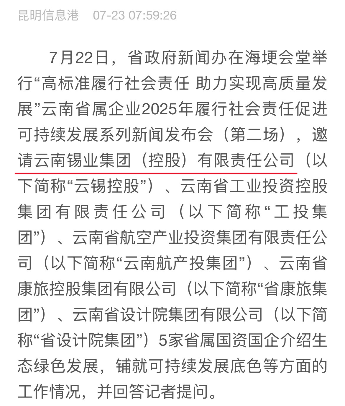 鏈接:(央廣網)、(央視影音)、(新華網)、(新華時訊)、(中國日報網)、(中國新聞網)、(中國網)(云南新聞聯播)、(云南衛視晚間新聞)、(云南發布)、(云南日報)、(云南日報-云新聞)、(云南網)、(七彩云端)、(云南省人民政府)、(云嶺先鋒網)、(云南國資)、(云南政協報)、(有色金屬報)、(有色新聞)、(騰訊新聞)、(今日頭條)、(搜狐)、(網易)、(新浪微博)、(新浪財經)、(都市時報)、(國泰君安)、(昆明日報)、(春城晚報)、(昆明信息港)、(開屏新聞)