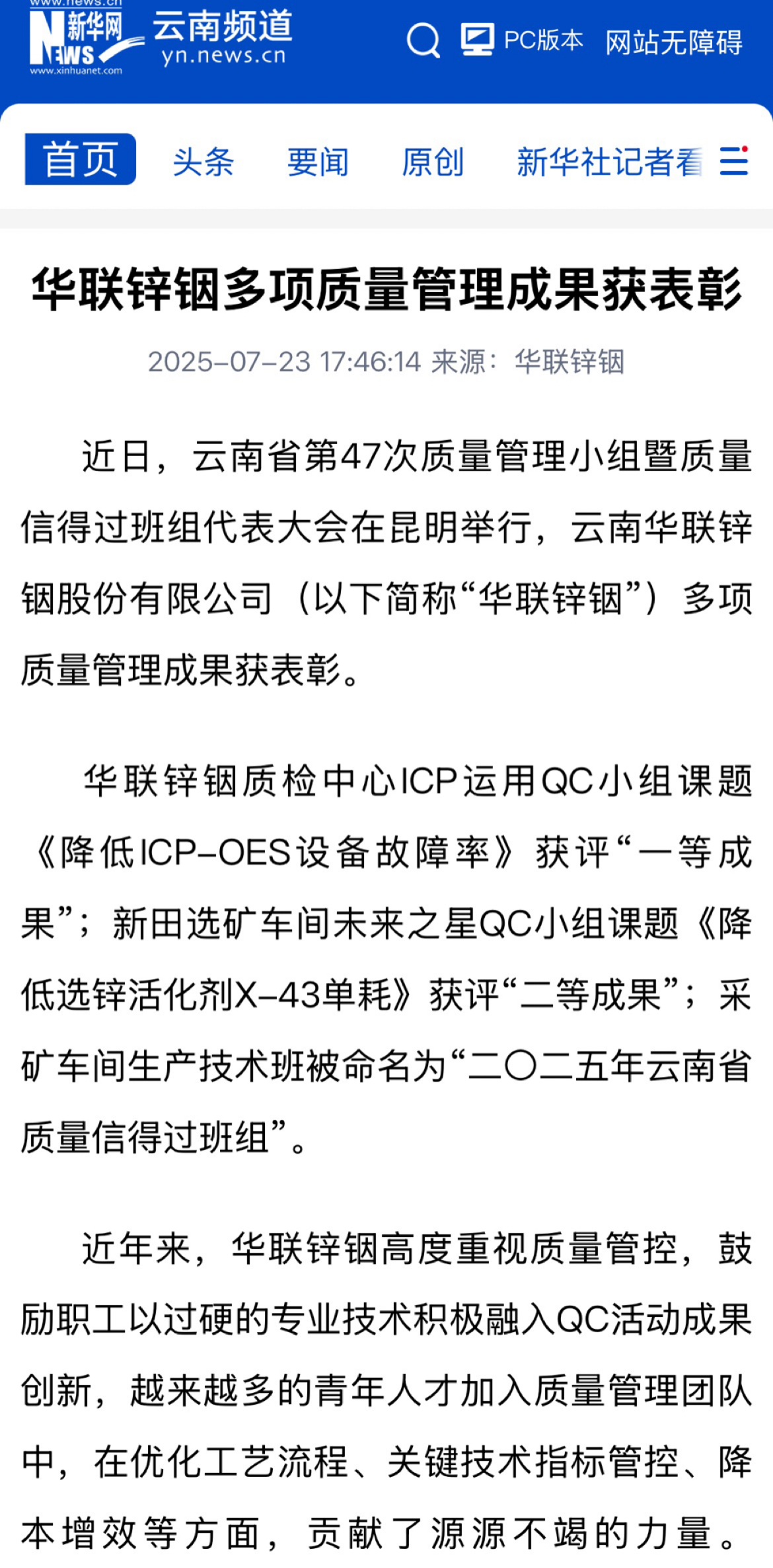 新華網:華聯鋅銦多項質量管理成果獲表彰