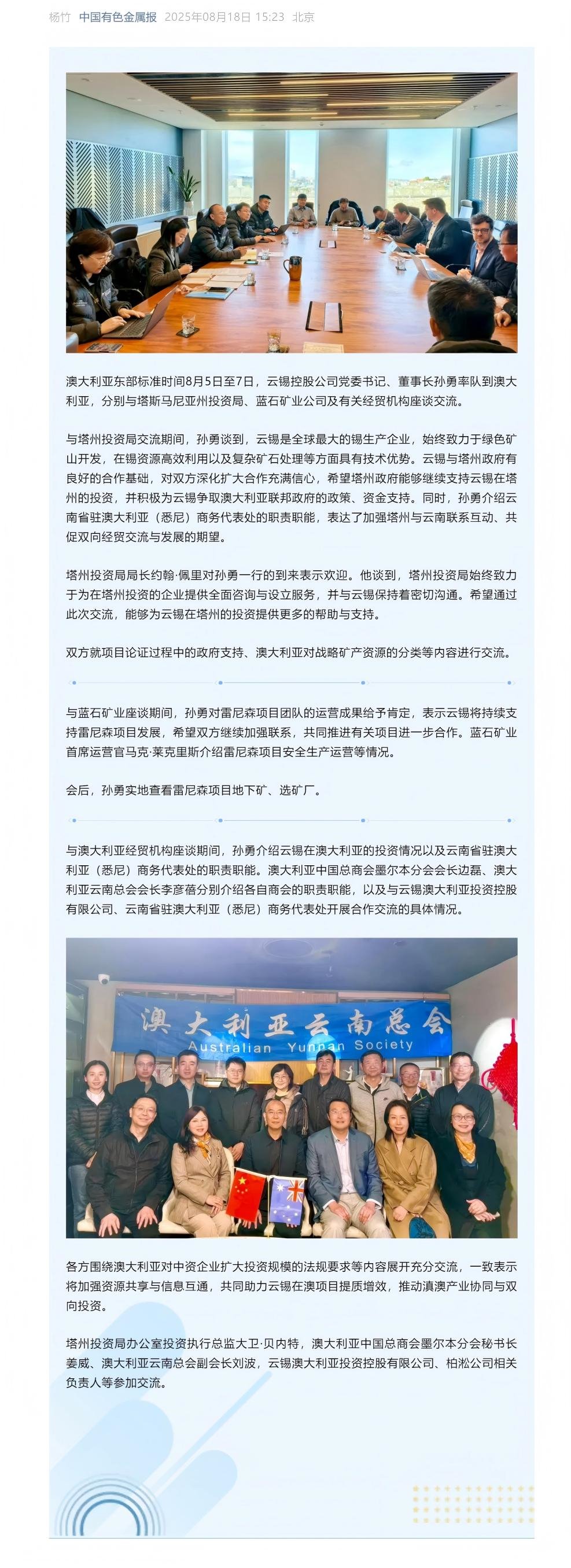 中國有色金屬報:云錫控股公司黨委書記、董事長孫勇率隊與澳大利亞塔斯馬尼亞州投資局、藍石礦業、經貿機構座談交流