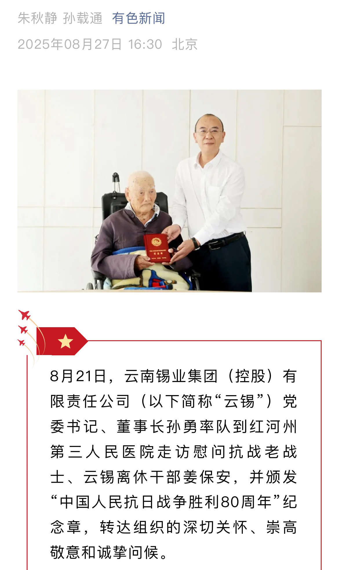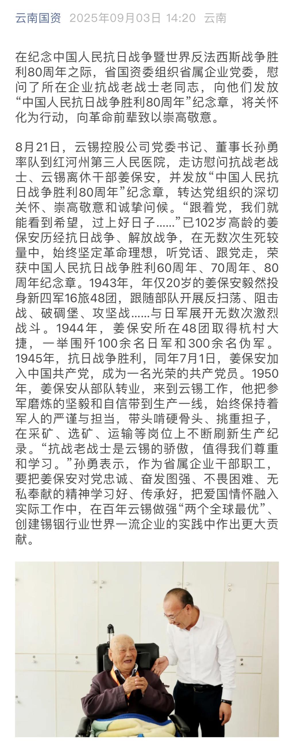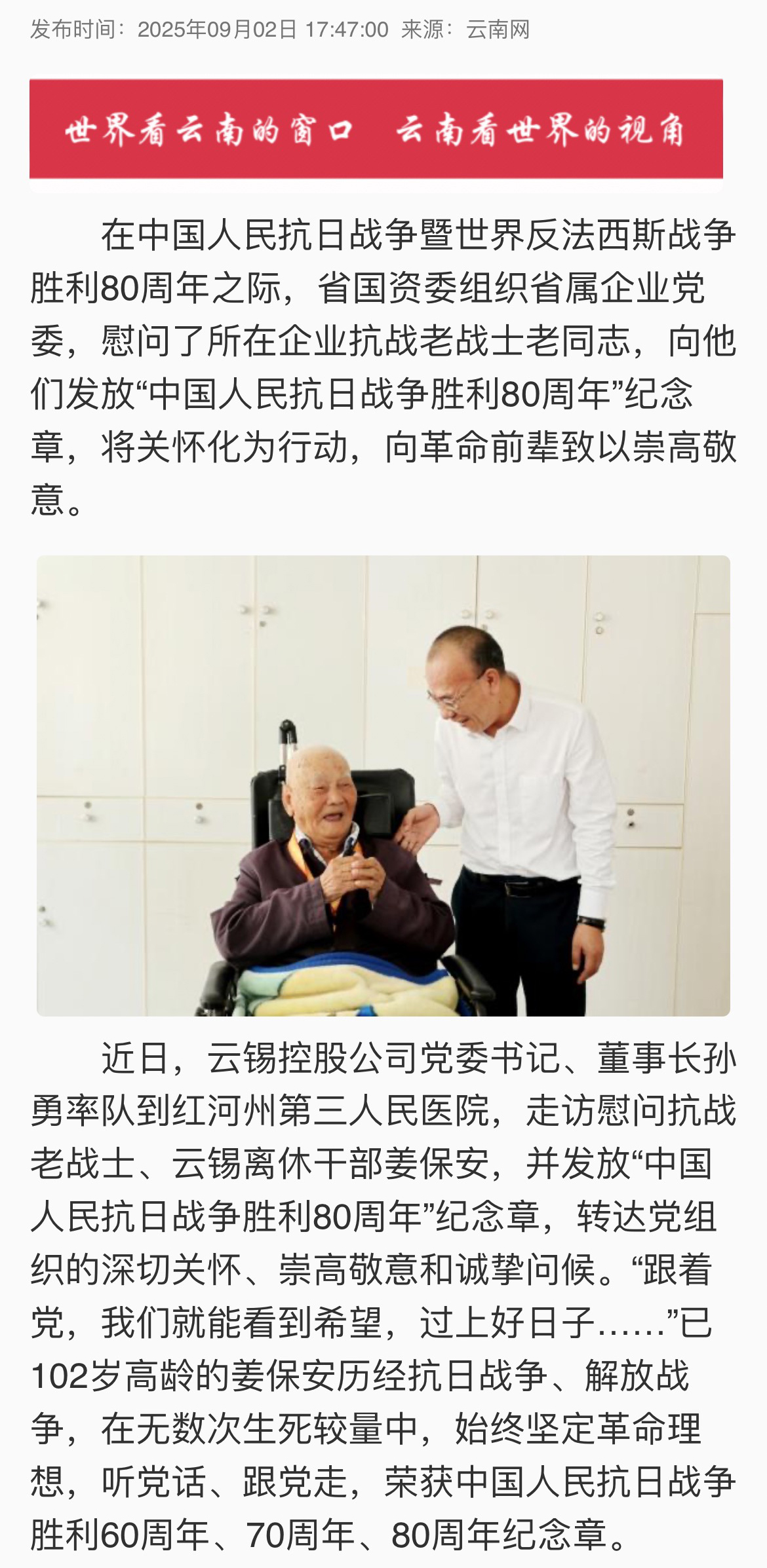 8月21日,云錫控股公司負責人到紅河哈尼族彝族自治州第三人民醫院,走訪慰問抗戰老戰士、云錫離休干部姜保安,并發放“中國人民抗日戰爭勝利80周年”紀念章,轉達黨組織的深切關懷、崇高敬意和誠摯問候。已102歲高齡的姜保安歷經抗日戰爭、解放戰爭,在無數次生死較量中,始終堅定革命理想,聽黨話、跟黨走。1943年,20歲的姜保安毅然投身抗日戰爭時期威震大江南北的“老虎團”——新四軍16旅48團,跟隨部隊與日軍展開無數次激烈戰斗。1944年,姜保安所在48團取得杭村大捷,一舉圍殲100余名日軍和300余名偽軍。1945年7月1日,姜保安光榮加入中國共產黨。1950年,姜保安從部隊轉業,到云錫工作,他始終保持著軍人的嚴謹與擔當,帶頭啃硬骨頭、挑重擔子,在采礦、選礦、運輸等崗位上不斷刷新生產紀錄。“抗戰老戰士是云錫的教案,值得我們尊重和學習。”云錫控股公司負責人表示,作為省屬企業干部職工,要把姜保安對黨忠誠、奮發圖強、不畏困難、無私奉獻的精神學習好、傳承好,把愛國情懷融入實際工作中,在百年云錫做強“兩個全球最優”、創建錫銦行業世界一流企業的實踐中作出更大貢獻。