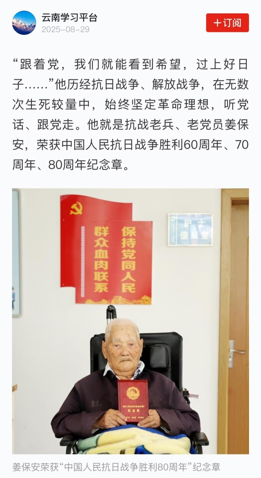 抗戰老戰士、云南煤炭產業集團退休職工閔爾騫捧著金燦燦的“中國人民抗日戰爭勝利80周年”紀念章激動地說:“這枚沉甸甸的紀念章對我意義非凡,它讓我重溫了那段崢嶸歲月,更讓我深切感受到黨和政府始終如一的關懷,以及對我們那一代人畢生奉獻的關心與肯定。”