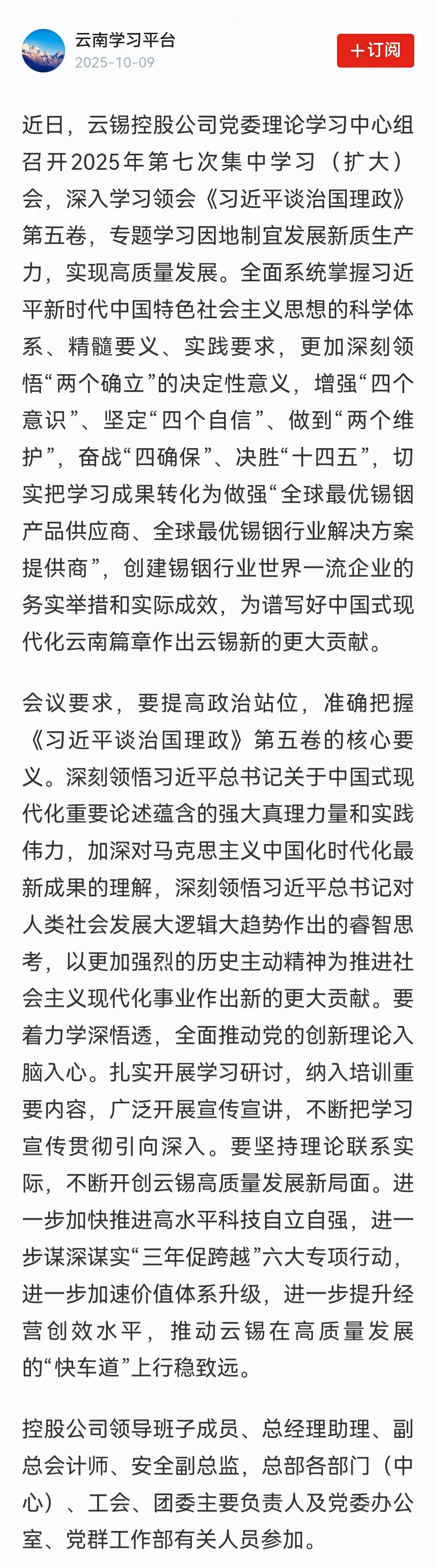 學習強國:云錫控股公司黨委理論學習中心組專題學習《習近平談治國理政》第五卷