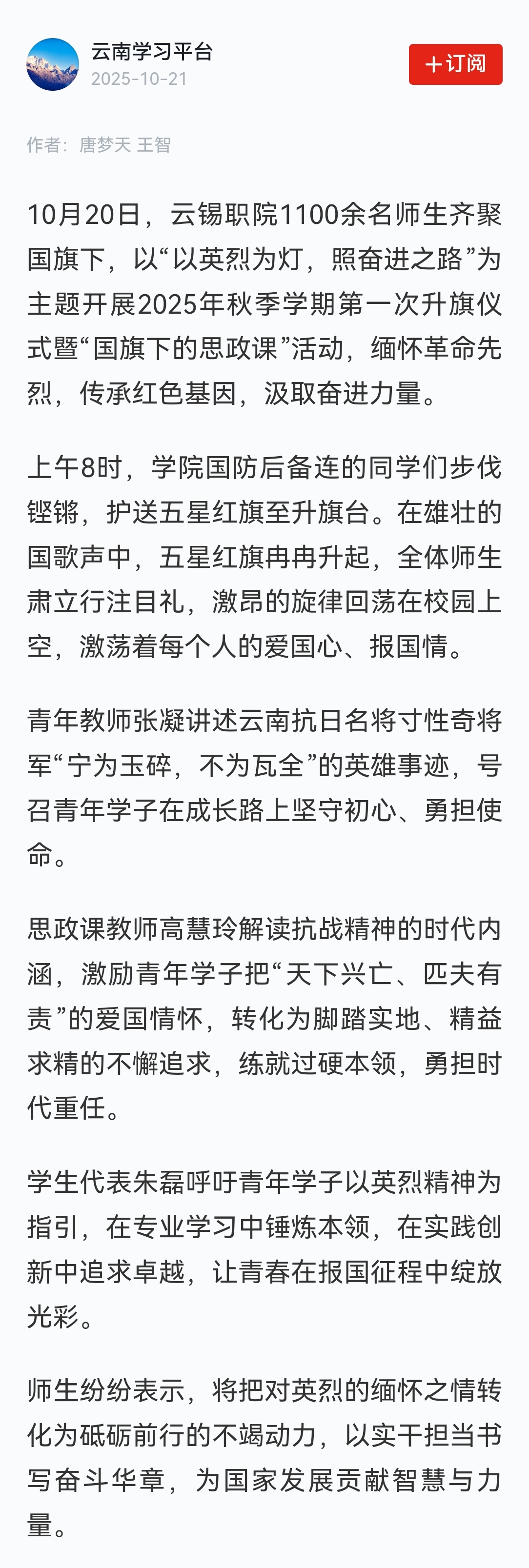 學習強國:云錫職院以英烈精神照亮奮進之路