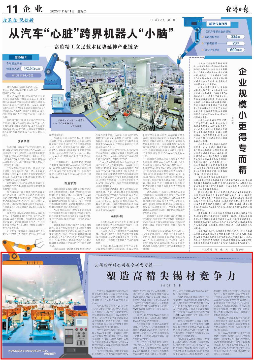 科技創新是云錫新材料公司發展的核心驅動力。通過整合研發資源,公司建有博士后科研工作站,擁有云南省錫新材料技術創新中心(籌)、電子錫焊料制備先進技術與應用工程研究中心、錫化工工程技術研究中心、昆明市軟釬焊料工程技術研究中心等創新平臺。解秋莉介紹,通過持續開展技術創新,公司研發出低輻射錫、金錫球、超細絲、預成型焊片、錫基阻燃劑、高純銦等新產品,推動產業鏈、創新鏈、知識產權鏈深度融合。目前,公司擁有授權發明專利110余項、實用新型專利20余項,制定或參與國家及行業標準80余項。