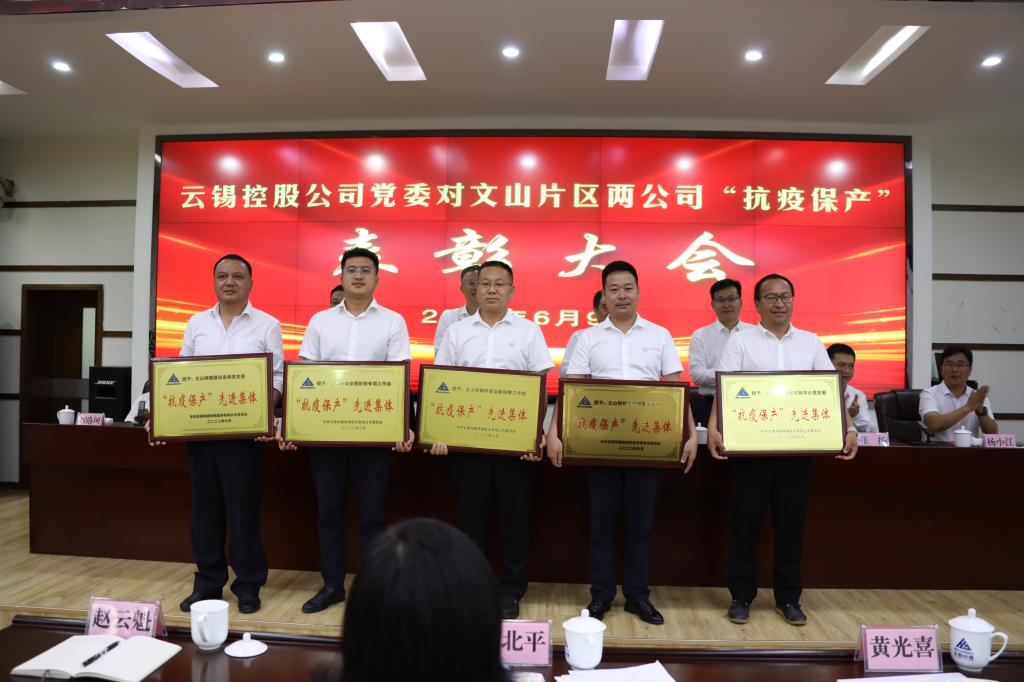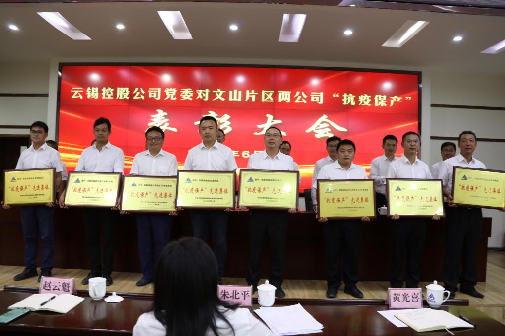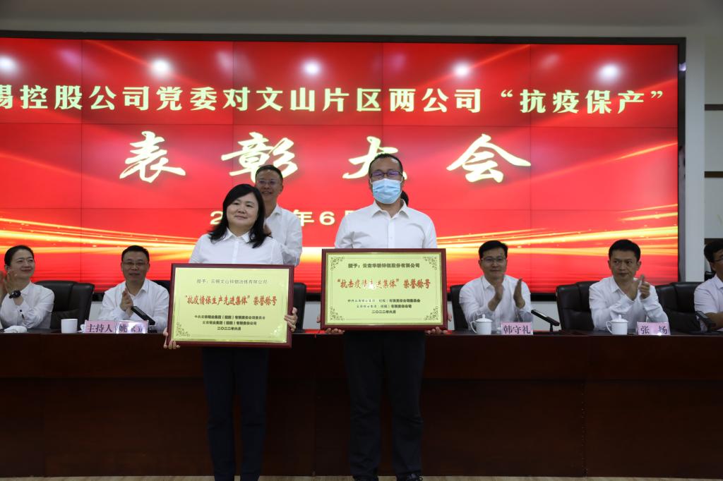 程睿涵宣讀云錫控股公司黨委表彰決定,授予華聯鋅銦“抗擊疫情先進集體”榮譽稱號,授予文山鋅銦“抗疫情保生產先進集體”榮譽稱號。
