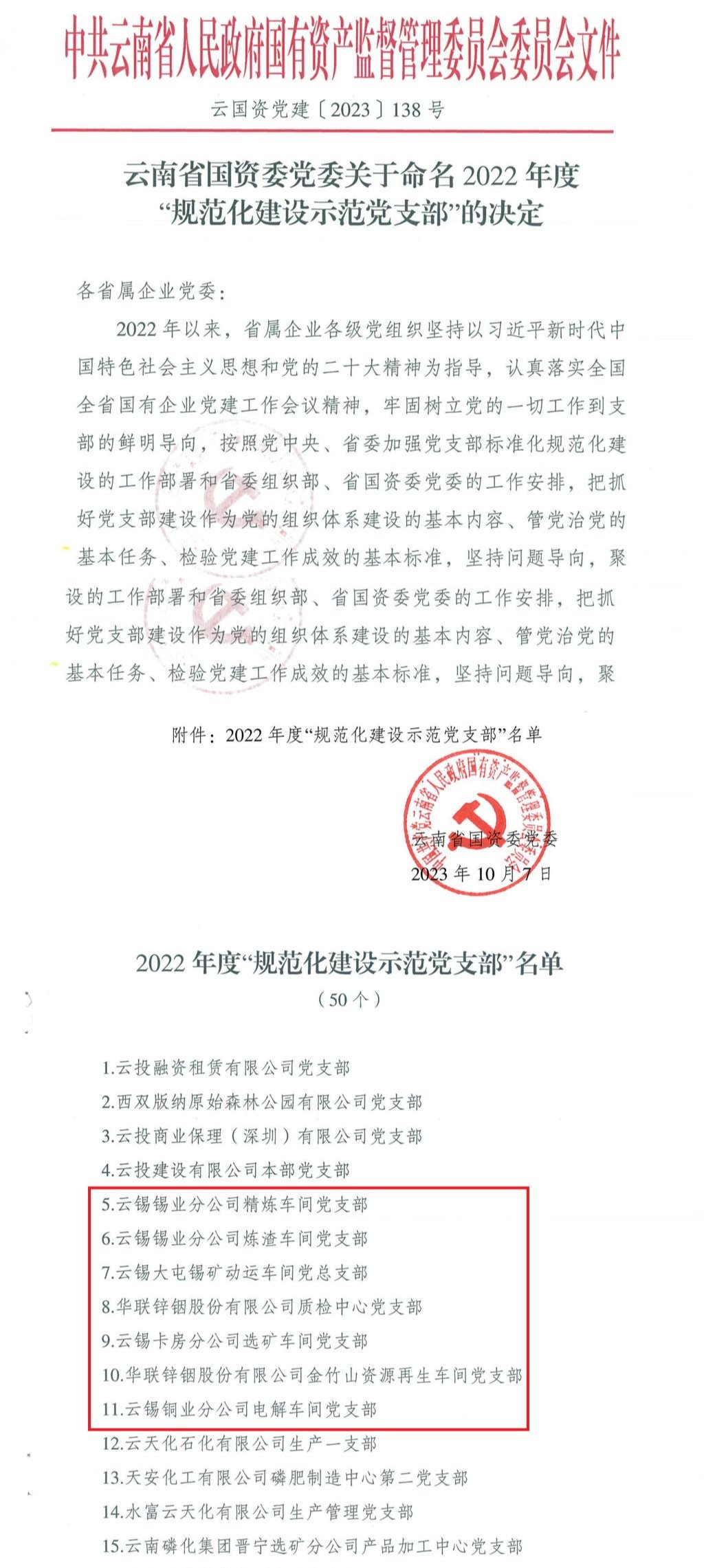 近日,省國(guó)資委黨委下發(fā)關(guān)于命名2022年度“規(guī)范化建設(shè)示范黨支部”的決定,命名50個(gè)黨支部為“規(guī)范化建設(shè)示范黨支部”,其中,云錫錫業(yè)分公司精煉車間等7個(gè)黨支部獲得命名。