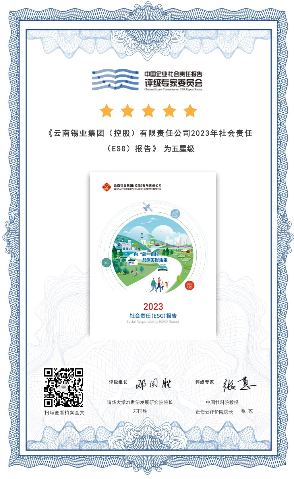 8月16日,中國企業社會責任報告評級專家委員會發布評級結果,《云南錫業集團(控股)有限責任公司2023年社會責任(ESG)報告》首次獲得“五星級”評價,被綜合評定為“是一份卓越的企業社會責任報告”。這是云錫自上一年度社會責任報告首次參評即獲四星半級以來,在ESG領域全面對標一流企業取得的新突破。
