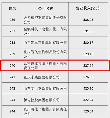 日前,中國(guó)企業(yè)聯(lián)合會(huì)、中國(guó)企業(yè)家協(xié)會(huì)聯(lián)合發(fā)布2024中國(guó)企業(yè)500強(qiáng)、中國(guó)制造業(yè)企業(yè)500強(qiáng)榜單。云錫位列2024中國(guó)企業(yè)500強(qiáng)第458位、中國(guó)制造業(yè)企業(yè)500強(qiáng)第240位。