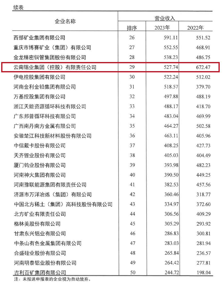 在中國(guó)有色金屬工業(yè)協(xié)會(huì)發(fā)布的2023年有色金屬企業(yè)50強(qiáng)榜單中,云錫位列第29位。