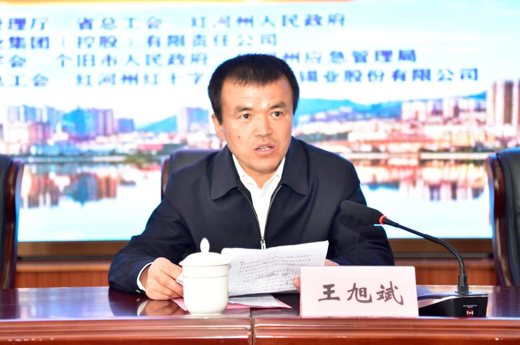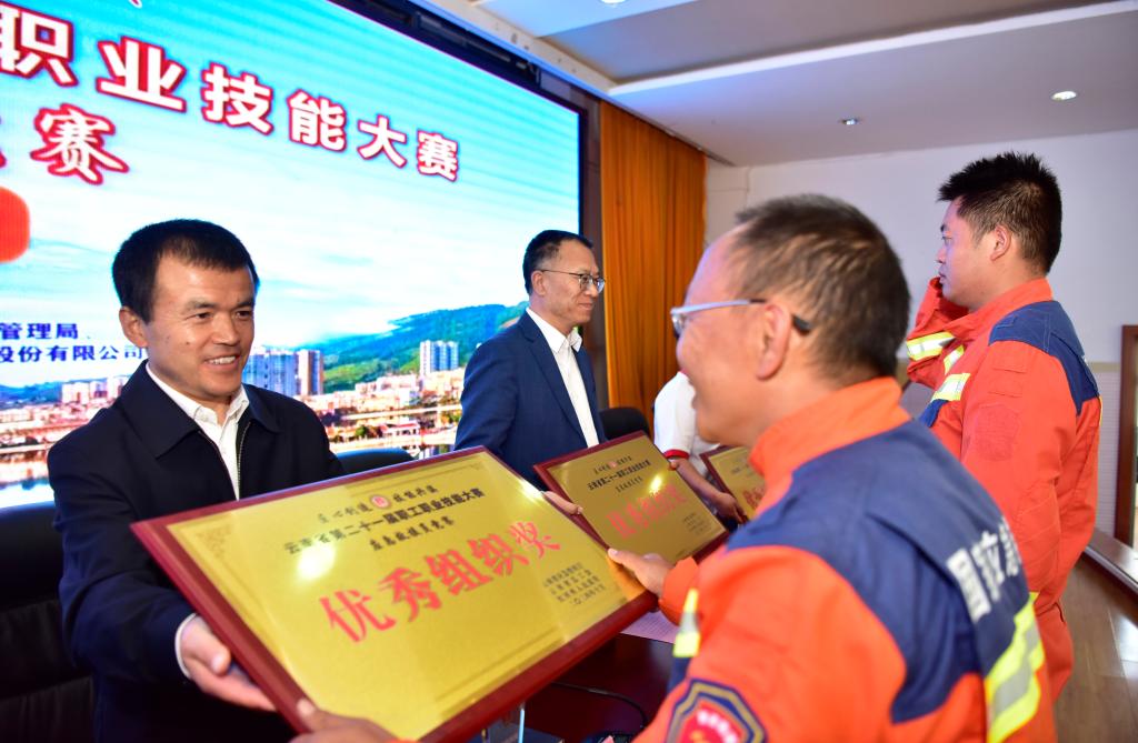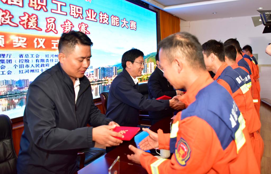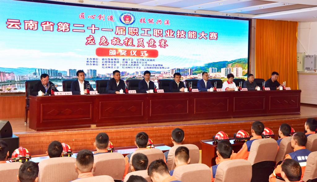 10月27日上午,云南省第二十一屆職工職業技能大賽應急救援員競賽閉幕式在云錫職院舉行。省應急管理廳黨委委員、副廳長王旭斌講話。控股公司黨委副書記、工會主席劉俊,黨委委員、副總經理宋興誠出席。