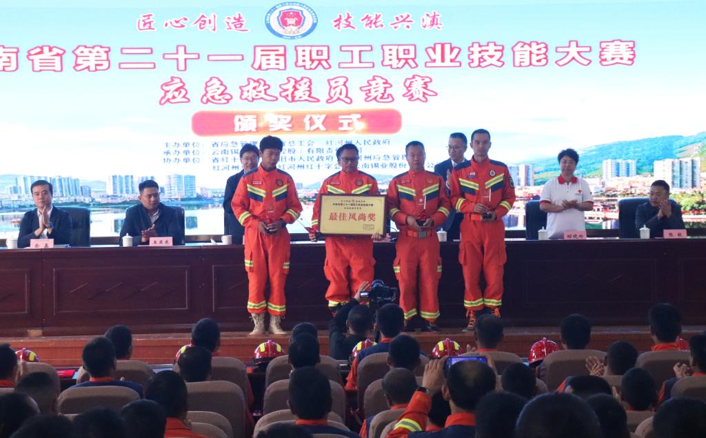省應急管理廳救援協調和預案管理處處長李柱主持閉幕式并宣布競賽成績。云錫應急救援隊獲團體第六名、礦山冒頂事故處置科目第三名、最佳風尚獎。