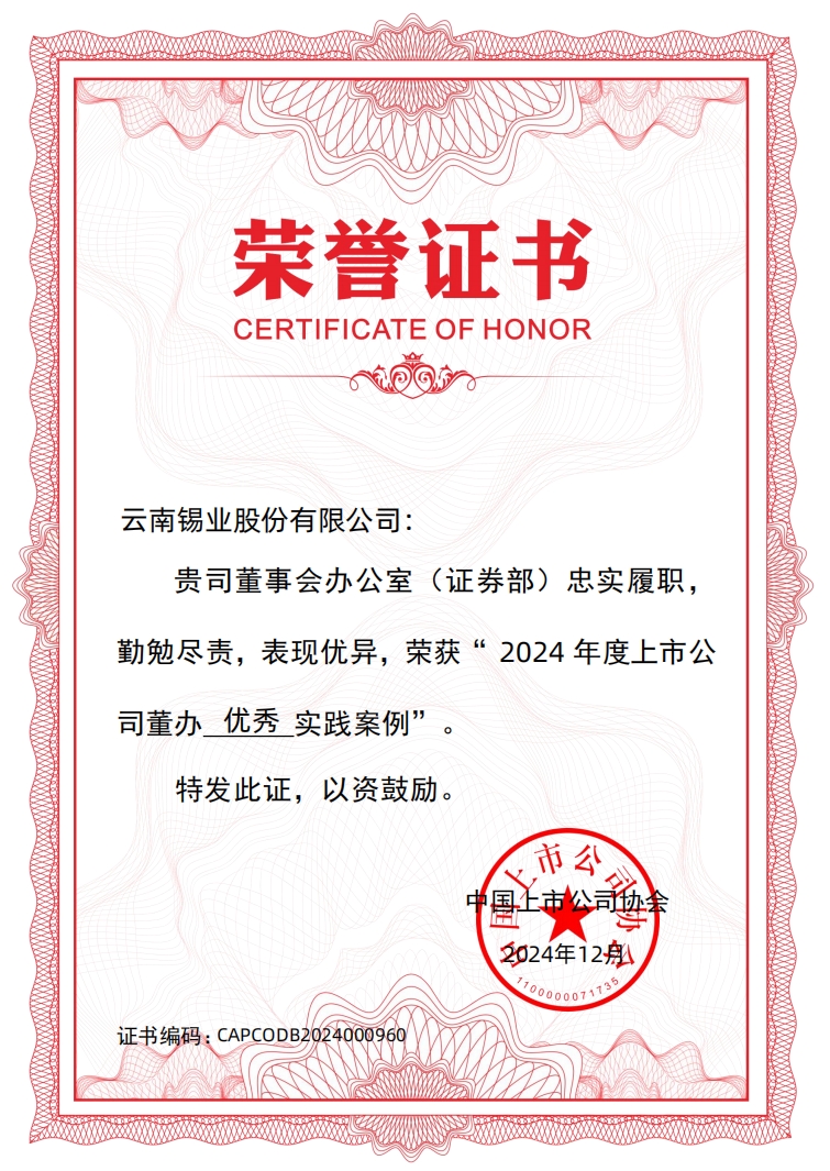 此次獲獎體現(xiàn)了中國上市公司協(xié)會以及資本市場對錫業(yè)股份董辦工作的充分肯定和高度認可。面向未來,錫業(yè)股份董辦將持續(xù)優(yōu)化公司治理體系,提升信息披露質(zhì)量和ESG管理水平,推動公司可持續(xù)高質(zhì)量發(fā)展,努力為廣大股東及各利益相關(guān)方創(chuàng)造更多價值。